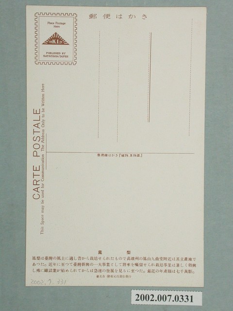 1.本物件以臺灣水果為主題,彩色樣式。正面為鳳梨之圖像。背面右上角為郵票黏貼處,以及1個印有「特許 K.I.」三角形商標,右側有「郵便はがき」,上方以英文字母書寫「CARTE POSTALE」、「This Space may be used for Communication」、「The Address Only to be Written Here」。下方有「鳳梨は臺灣の風土に適し昔から栽培せられたもので高雄州の鳳山九曲堂附近は其主產地であつた。近年に至つて臺灣新興の一大事業として將來を矚望せられ栽培事業は著しく索興し殊に罐詰業が始められてからは急速の發展を見るに至つた。最近の年產額は七千萬顆。」大意為:臺灣氣候適合種植鳳梨,尤為高雄鳳山九曲堂附近為鳳梨主要產地。農業栽培、罐頭業乃臺灣近期的新興事業,產量明顯提高,近年產額高達七千萬顆。左側亦以漢字標示「 臺北市 菊元百貨店發行」,中間有「臺灣繪はガき『植物 果物篇』」。