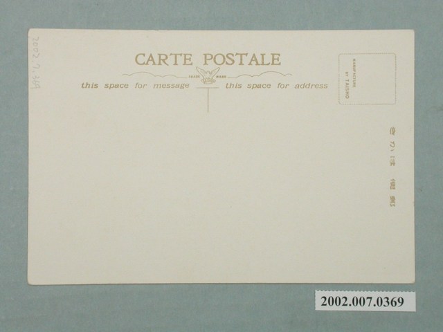 1.本物件以臺灣水果為主題,黑白樣式。正面為香蕉串之圖像,結實纍纍。上方以英文字母書寫「Bananas growing richly.」、「Taiwan」,下方以漢字與日文書寫「臺灣生果の王座を占めるものはバナナである。年產額二億五千万斤、價格一千三四百万圓。種類は仲々多いが北蕉と仙人種が最も普通で栽培は山地と平地で行はれ、その面積は一万五六千甲の廣きに達する。一花苞は六段から九段の房となつて垂れ下るが、總重量は二五O斤に達することがある」(大意為臺灣水果寶座非香蕉不可,年產額達兩億五千萬斤,產值達一千三百萬至一千四百萬元。其種類之多,尤為「仙人種」的香蕉,在山地與平地皆可見其蹤影。香蕉開花時,約分為六段至九段,最高可達兩百五十斤)。背面右上角為郵票黏貼處,右側有以漢字、平假名書寫之「郵便はがき」,上方以英文字母書寫「CARTE POSTALE」、「This space for message」、「This space for address」,中間有一鳥類圖像,標示「TRADE MARK」。