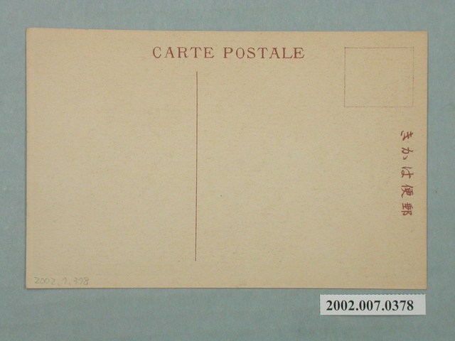 1.本物件以臺灣水果為主題,黑白樣式。正面為香蕉園之圖像,各香蕉樹整齊排列之圖像。下方以漢字與日文書寫「バナナ園(其ノ一)」。背面右上角為郵票黏貼處,右側有以漢字、平假名書寫之「郵便はがき」,上方以英文字母書寫「CARTE POSTALE」。