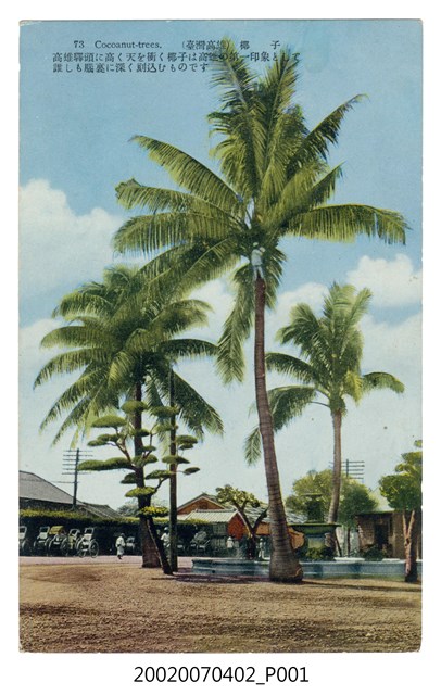 3.上有說明文字:「73 Cocoanut-trees.(臺灣高雄)椰子,高雄驛頭に高く天を衝く椰子は高雄の第一印象,として誰しも腦裏に深く刻込むものです。」(中譯:在高雄車站高聳入天的椰子是高雄的第一印象,無論誰都會印象深刻。)背面則印刷有「POST CARD、郵便はがき、臺北生蕃屋本店印行」等字。本件約為1930-1939年間發行。