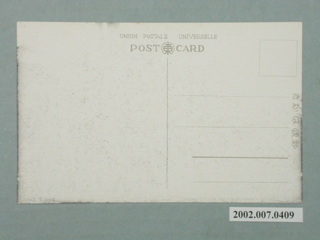 1.本物件以臺灣植物為主題,黑白樣式。正面為一人站在整齊排列的椰子林前。左下以漢字與日文書寫「(臺灣高雄)密生せろ旗後の椰子林」,以英文字母書寫「The view of thick forest od coconut plant at Kigo, Takao」。背面右上角為郵票黏貼處,右側有以漢字、平假名書寫之「郵便はがき」,上方以英文字母書寫「POST CARD」、「UNION POSTALE. UNIVERSELLE」,中間有一「東」字標誌。2.日治時期,日人透過官方出版品、明信片,將臺灣形象塑造成風光明媚、熱帶地區的印象,椰子樹則在當時成為臺灣為熱帶南國的代表景觀植物之一,北至臺北南至屏東,各地景點皆可見椰子樹的蹤影。