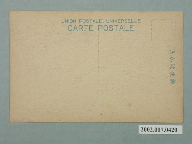 1.本物件以臺灣植物為主題,黑白樣式。正面為成排的檳榔樹林位於山林間。下方以漢字書寫「檳榔樹林」。背面右上角為郵票黏貼處,右側有以漢字、平假名書寫之「郵便はがき」,上方以英文字母書寫「CARTE POSTALE」、「UNION POSTALE. UNIVERSELLE」。2.日治時期文獻多提到臺灣人嚼食檳榔的習俗,且視為臺人惡習,故初期曾禁止臺灣人種植與嚼食檳榔。中後期,檳榔儼然成為東臺灣「殖民地景」,與棕櫚樹同樣列入移民村的作物栽培建議。後期則轉為輔導檳榔園轉作其他水果。