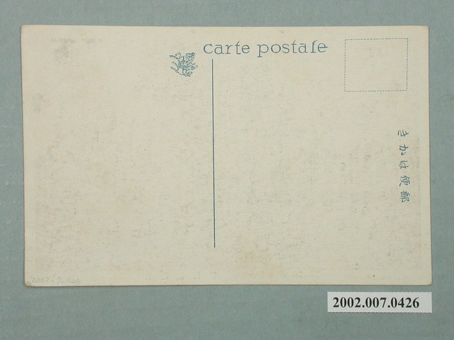 1.本物件以臺灣植物為主題,黑白樣式。正面遠景為檳榔林之圖像,近景為一片雜草地。下方以漢字書寫「台灣檳榔樹」,以英文字母書寫「The Betelnut in Formosa.」,左下角以漢字標示「澎湖島坂井書店發行」。背面右上角為郵票黏貼處,右側有以漢字、平假名書寫之「郵便はがき」,上方以英文字母書寫「CARTE POSTALE」。2.日治時期文獻多提到臺灣人嚼食檳榔的習俗,且視為臺人惡習,故初期曾禁止臺灣人種植與嚼食檳榔。中後期,檳榔儼然成為東臺灣「殖民地景」,與棕櫚樹同樣列入移民村的作物栽培建議。後期則轉為輔導檳榔園轉作其他水果。