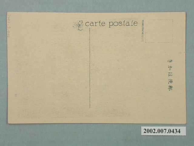 1.本物件以臺灣植物為主題,黑白樣式。正面為細長檳榔林之圖像,下方以漢字書寫「檳榔樹林(臺南州)」。背面右上角為郵票黏貼處,以英文字母標示「SEIUNDO PRINTING CO.LTD」,右側有以漢字、平假名書寫之「郵便はがき」,上方以英文字母書寫「CARTE POSTALE」。2.日治時期文獻多提到臺灣人嚼食檳榔的習俗,且視為臺人惡習,故初期曾禁止臺灣人種植與嚼食檳榔。中後期,檳榔儼然成為東臺灣「殖民地景」,與棕櫚樹同樣列入移民村的作物栽培建議。後期則轉為輔導檳榔園轉作其他水果。