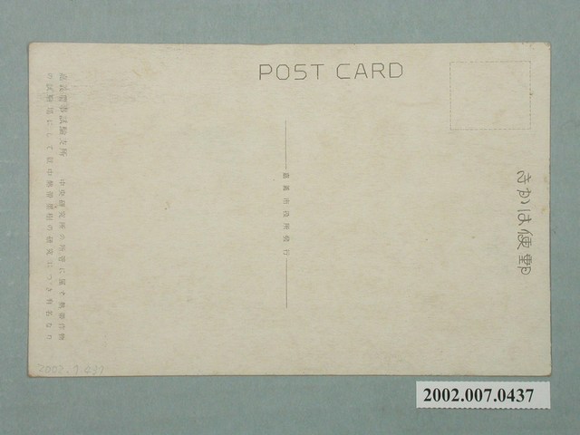 1.本物件以熱帶菓樹園為主題,彩色樣式。正面右側為一柚子樹種植於草地中的圖像,柚子樹上結實纍纍,皆是綠色的柚子。背面右上角為郵票黏貼處,右側有「郵便はがき」,上方以英文字母書寫「POST CARD」,左側書寫「中央研究所の所管に屬す熱帶作物の試驗場にして就中熱帶果樹の研究につき有名なり」大意為:嘉義農事試驗支所為中央研究所的熱帶作物試驗場,尤以熱帶果樹的研究而聞名。中間以漢字標示「嘉義市役所發行」。