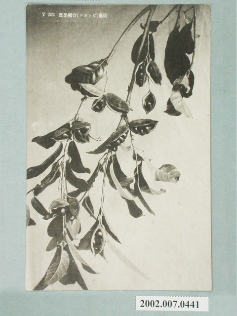1.本物件以臺灣植物為主題,黑白樣式。正面為萍婆枝葉與其果實的特寫圖像,上方有「萍蔢(ピンポン)台灣果實 Y252」。背面右上角為郵票黏貼處,右側有「郵便はがき」,上方以英文字母書寫「CARTE POSTALE」、「UNION POSTALE. UNIVERSELLE」。