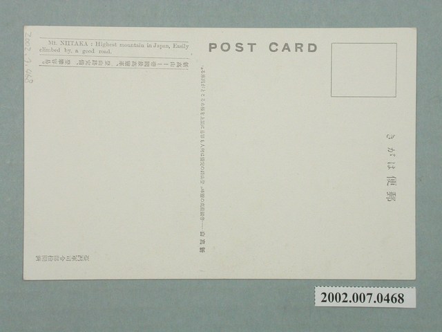 2.正面影像下方印有灰色文字「新高山」,背面則印有灰色文字「郵便はがき,POST CARD,新高山--帝國最高靈峯、登山路完備、登攀容易,Mt. NIITAKA: Highest mountain in Japan, Easily climbed by a good road.,新高山、帝國最高の靈峰。登山路の完備は何人も容易に頂上を極めることが出來る。臺灣軍司令檢閱濟。」說明以中文、英文、日文三種語言標示,經臺灣軍司令部檢閱許可。