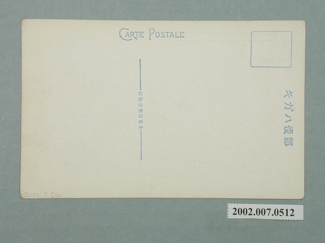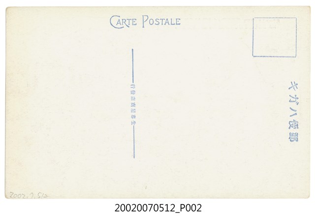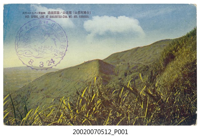 2.正面影像滿版印刷,上方印有棕色說明文字:「(台灣阿里山)獨立山ノ旋回鐵道 四旋回シテ上ル一千尺、142.SPIRAL LINE AT DOKURITSU-ZAN, MT. ARI, FORMOSA.」(譯:獨立山螺旋鐵路,繞行四圏爬升1000尺),並蓋有紫色紀念圓戳,中間為夕陽、森林、山岳與雲海組合圖案,上寫「台灣阿里山標高八千尺」,下為戳印日期「8、3、24」,應為昭和8年3月24日。背面則印有藍色文字「郵便ハガキ、CARTE POSTALE、生蕃屋商店發行」。本件與館藏號2002.007.0513為不同版次印刷。