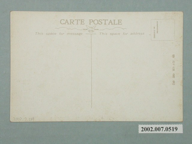2.正面影像滿版印刷,左下方印有白色說明文字:「(臺灣)阿里山より南方を望む、奇峰屹立遙々として雲涯に聳ゆる青壁の削れるが如き壯觀は阿里山の誇りである。」(譯:從阿里山南望,遠方雲端奇峰遙遙聳立,壯觀的景象是阿里山的驕傲。)背面印刷有「郵便はがき、CARTE POSTALE」等字,通信欄與地址欄分隔線上有「TAISHO」信鴿商標圖案,郵票張貼處印有「MANUFACTURE BY TAISHO」。