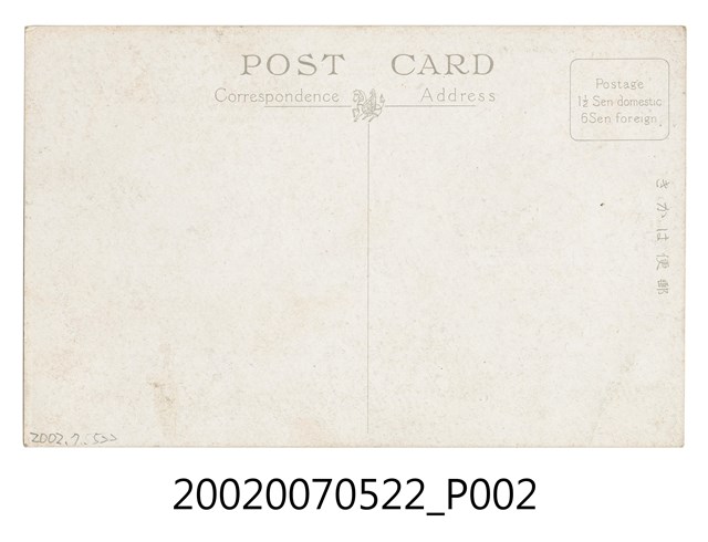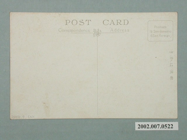 2.正面影像滿版、黑白印刷,左上方印有黑色文字「(臺灣)阿里山=全景」,背面則印有灰色文字「郵便はかき、POST CARD、Correspondence、Address」,通信欄與地址欄分隔線上有飛馬商標圖案,郵票方框印有面額「Postage、1 1/2 Sen domestic、6 Sen foreign」。