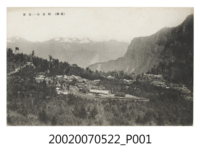 1.單色印刷明信片,影像內容為遠眺阿里山林業聚落全景。