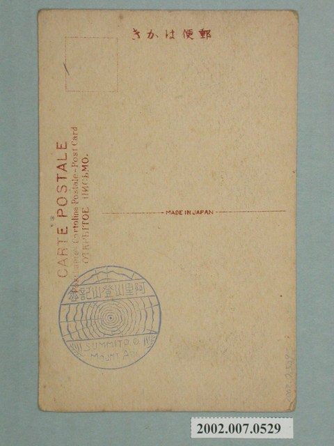 2.正面黑白影像滿版印刷,下方印有藍色說明文字:「(不許復製) 阿里山哆羅嘕ヨリ見タル塔山大景 (ノ.4)」。背面則印有棕色文字「郵便はかき、CARTE POSTALE、Postkarte-Cartolina Postale-Post Card、OTKPbITOE IIИCbMO.、MADE IN JAPAN.」,並蓋有藍色紀念圓戳,圓戳中央為樹木年輪圖案,上寫「阿里山登山記念」,下寫「SUMMIT P.O. MONUT ARI」。