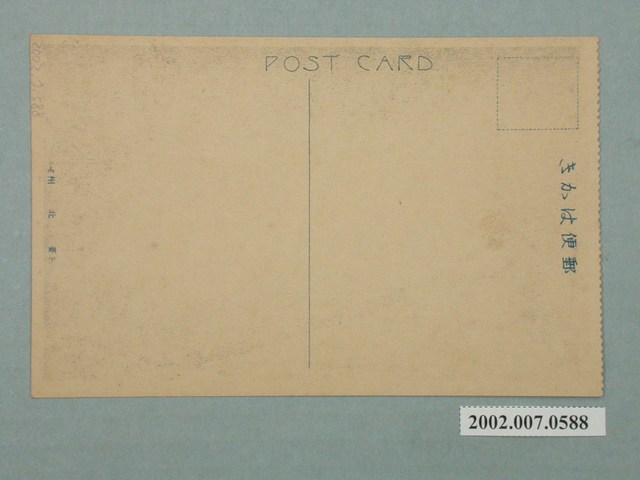 1.臺北州發行之雙色印刷明信片,影像內容為烏來瀑布。 2.正面黑白影像滿版印刷,四周白邊,下方印有說明文字「ウライ瀧」。背面印有藍色文字「郵便はかき、POST CARD、臺北州」,一側有撕痕,應為明信片整本裝訂邊。