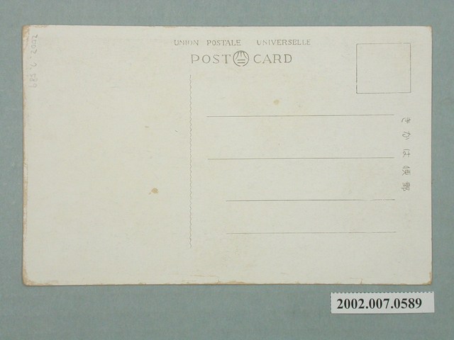 1.黑白單色印刷明信片,影像內容為阿里山眠月附近的仙人洞(千人洞)妻戀瀑布。仙人洞,又名千人洞、千人巖,位於今豐山地區的石鼓盤溪上流,是臺灣最大的天然洞穴,其旁有一瀑布,雨季時可見水量豐沛的瀑布直奔而下。