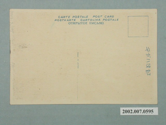 2.正面影像黑白印刷,四周留白邊,影像下方印有藍色說明文字:「阿里山ノ伐木 FELLING OF TREES, MT. ARI.」。背面則印有藍色文字「郵便ハガキ、CARTE POSTALE、POST CARD、POSTKARTE、CARTOLINA POSTALE、OTKPbITOE IIИCbMO.、MADE IN JAPAN」等字。