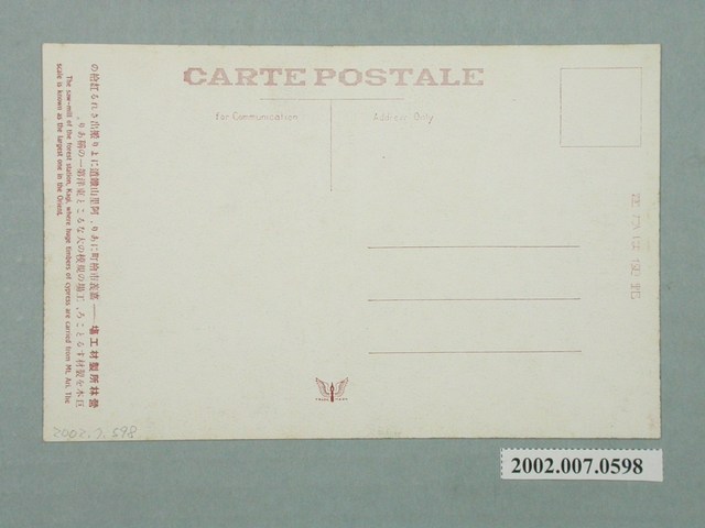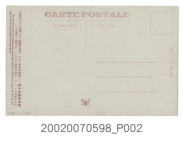 2.正面影像滿版印刷,無說明文字,背面則印有紅色文字「郵便はかき,CARTE POSTALE、for Communication、Address only、營林所製材工場……嘉義市檜町にあり、阿里山鐵道により搬出される紅檜の巨木を製材するとこと、工場の規模の大なること東洋第一の稱あり。The saw-mill of the forest station, Kagi, where huge timbers of cypress are carried from Mt.Ari. The scale is known as the largest one in the Orient.」(譯:營林所製材工場位於嘉義市檜町,有從阿里山鐵路運出紅檜巨木的加工製材地方,其工場規模之大,號稱東洋第一),以及展翅鳥類商標圖案。