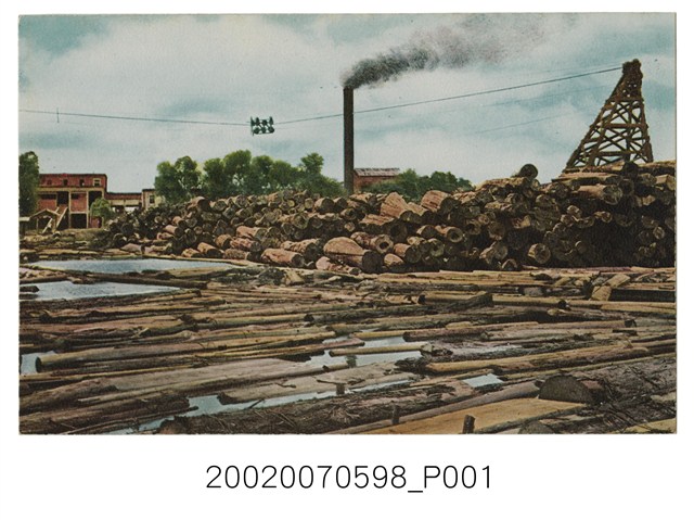 1.多色印刷明信片,影像內容為營林所嘉義製材工場的貯木池。