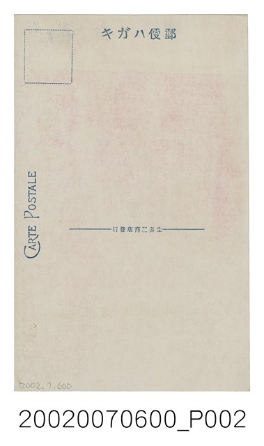 2.正面影像滿版印刷,上方印有紅色文字「(台灣)東洋第一嘉義製材所 140.TIMBER-MILL, KAGI, FORMOSA.」,背面則印有藍色文字「郵便ハガキ、CARTE POSTALE、生蕃屋商店發行」。