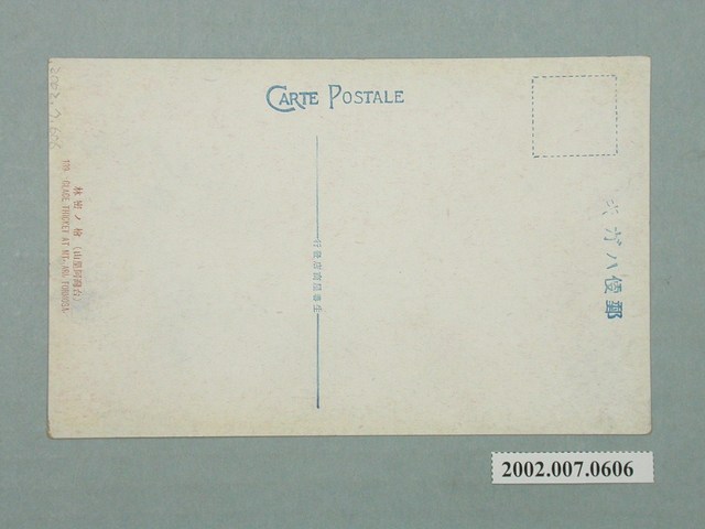 2.正面影像滿版印刷,無文字。背面則印有藍色文字「郵便ハガキ、CARTE POSTALE、生蕃屋商店發行」,以及紅色說明文字「(台灣阿里山)檜ノ密林 139. CLAGE THICKET AT MT. ARI, FORMOSA.」。