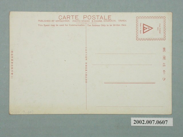 2.正面黑白影像2張,右上方印有說明文字「⑦羅東營林所貯木池ニ浮ブ扁柏紅檜丸太貯木ノ狀況」。背面印有紅色文字「郵便はかき、CARTE POSTALE、PUBLISHED BY KATSUYAMA PHOTO STUDIO 3-CHOME. KYOMACHI. TAIPEH.、This Space may be used for Communication、The Address Only to be Written Here、台北市川端町 南國寫真大觀社調製、(營林所羅東出張所發行)」,以及郵票張貼方框內印有「Place Postage Here、Made in Japan」與「P」三角形商標圖案。