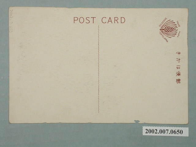 1.本物件為以蝴蝶蘭為主題之明信片,正面有蝴蝶蘭黑白照片,畫面中可見1株蝴蝶蘭,開滿白色花朵,右下有1段文字「臺灣胡蝶蘭」,第2段「屏東順天堂製」;背面為空白明信片直式書寫面,以紅色單色印刷,左上為商標圖案與2行字樣,由上至下為「TRADE MARK」、「SHOSEIDO TOKYO JAPAN」,上方有「郵便はかき」字樣,左側有「POST CARD」字樣。2.蝴蝶蘭於西元1896年被發現於蘭嶼,其分布南至澳洲,北至臺灣,喜好高溫潮濕環境,於1910年代臺灣各地開始栽種蝴蝶蘭,舉辦大型品評會、競賽等,也明禁採取野生蝴蝶蘭,至1930年代,屏東逐漸成為蝴蝶蘭的重要培植地,1935年更成立「全臺灣蘭蕙會」,提供愛蘭人士相互交流、推廣蘭藝的平臺。