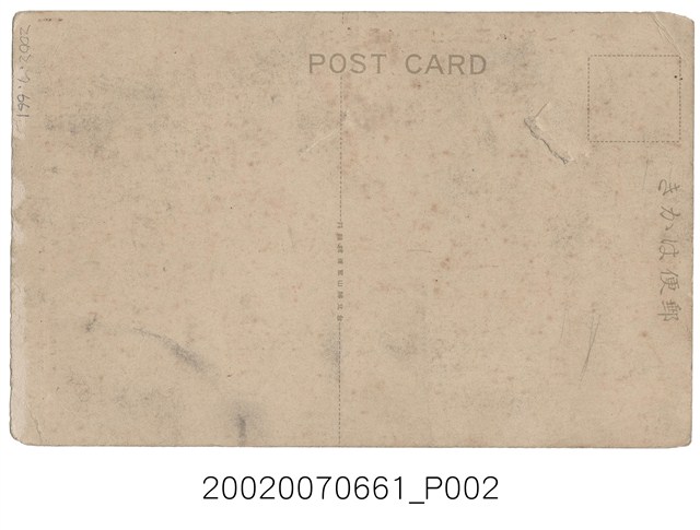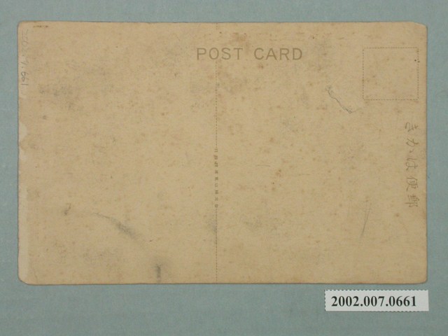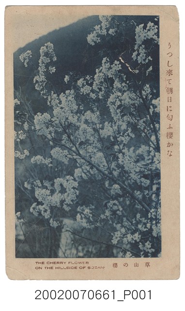 1.本物件為以草山的櫻花為主題之明信片,正面有櫻花黑白照片,畫面中可見粉白的櫻花開滿整枝枒,右側有1段文字「うつし來て朝日に匂ふ櫻かな」,右下有1段文字「草山の櫻」,左下有1段文字「THE CHERRY FLOWER ON THE HILLSIDE OF SOZAN.」;背面為空白明信片直式書寫面,以黑色單色印刷,左上為郵票黏貼處,上方有「郵便はかき」字樣,左側有「POST CARD」字樣,中央有「臺北勝山□□□發行」字樣。2.陽明山日治時稱草山,曾是簡大獅一夥抗日的據點,後發現草山地區有溫泉,漸漸使草山成為觀光旅遊勝地,西元1923年裕仁太子曾造訪草山,留下草山御賓館建築。櫻花主要產於溫帶地區,臺灣亦有原生種,主要種植於中北部平地或中低海拔山區,對推崇櫻花的日人來說,於臺灣的櫻花,有內地的意象。