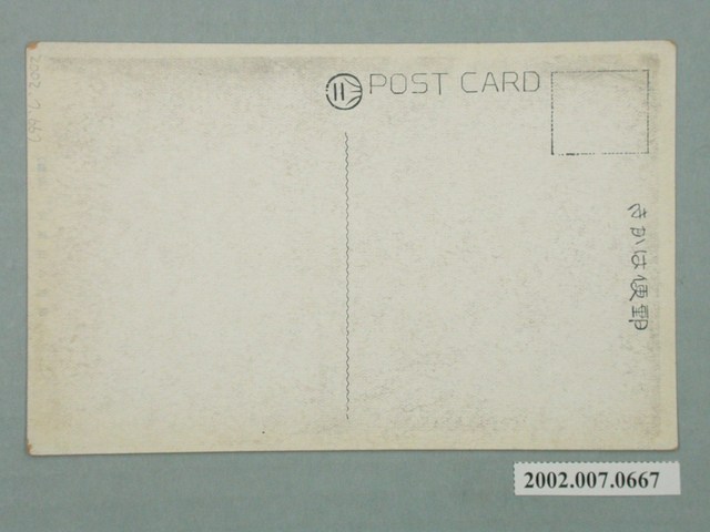 1.雙色印刷明信片,影像內容為阿里山公園內引自日本內地種植的八重櫻,花開的景象。八重櫻是阿里山種植的櫻花中,時序最晚開花的品種。 2.正面影像黑白印刷,四周留白邊,下方印有藍色文字「(臺灣)阿里山八重櫻」,背面則印有藍色文字「郵便はかき、POST CARD」,以及山形與圓形線條組合而成的商標圖案。