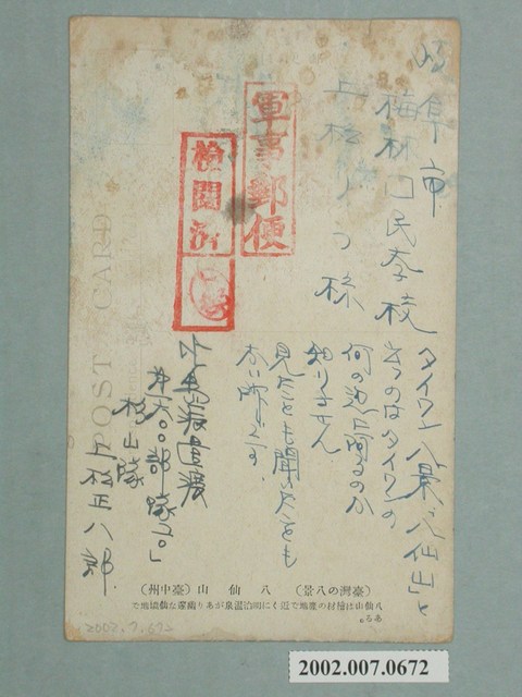 1.本件屬軍事郵件實寄封之多色印刷明信片,由在小島派遣渡第1600部隊「一○」杉山隊當兵的上松正八郎寄與岐阜市的上松リう先生,上蓋有軍事郵件檢閱證明章。影像內容為明治溫泉(今谷關溫泉)附近的大甲溪溪谷,架有吊橋。