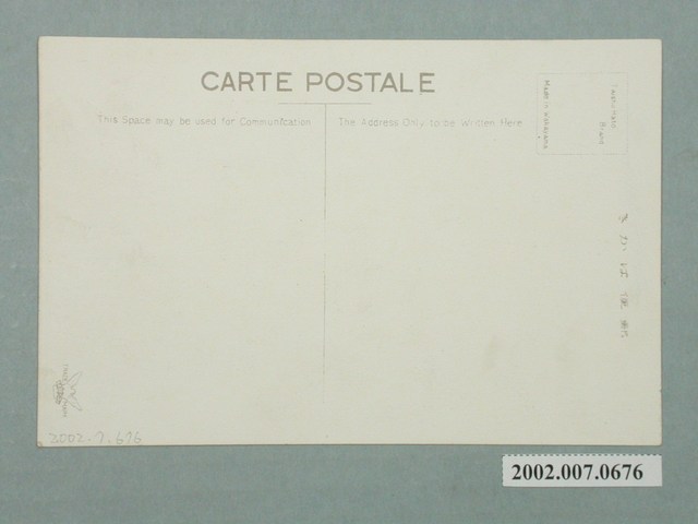 2.正面黑白影像,下方印刷有:「SUSPENSION BRIDGE. MT. KAPPAN. FORMOSA.、(臺灣蕃地 角板山)鐵線橋」,右上方蓋有「角板山登山記念」粉紅色圓戳。背面印刷有「郵便はがき、CARTE POSTALE」等字及「TAISHO」(日本和歌山大正寫真工藝所)信鴿商標圖案,郵票張貼處印有「Taisho Hato Brand、Made in Wakayama」。
