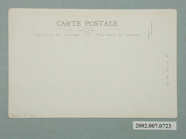 1.本物件為以屏東公園為主題之明信片,其正面為屏東公園黑白照片,畫面中可見草坪上正中間有大王椰子樹,左右及後方亦有許多闊葉樹木,明信片右下角有「屏東公園」字樣;背面為空白明信片橫式書寫面,以灰色單色印刷,右上角為郵票黏貼處,內有「MANUFACTURED BY TAISHO」字樣,右側有「郵便はかき」字樣,正上方則有「CARTE POSTALE」以及兩行字樣,由左至右為「This space for message」、「This space for address」。2.屏東公園建於西元1902年,為屏東市區第一個公園,其園內於1919年建造阿猴神社,此後成為屏東重要慶典、節日聚集地,此外於公園東側有一個末廣蹈荷社,其類似於地方所屬的小神社,此於戰後改建老人會涼亭,基座則改為防空洞。於戰後曾改稱「中山公園」,又在2016年的正名運動中改回屏東公園。