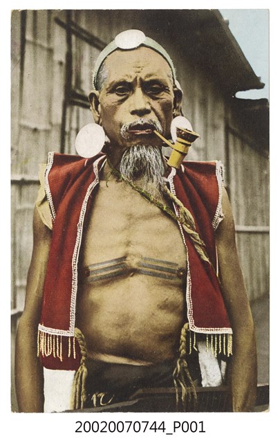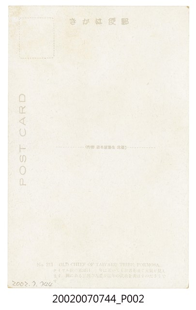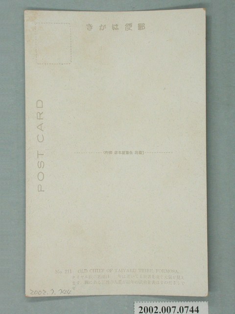 1.本物件以原住民為主題,彩色樣式。正面為一長者蓄有白色鬍鬚,穿著原住民傳統服飾,叼著傳統菸斗,其胸部有三條紋身。背面右上角為郵票黏貼處,右側有以漢字、平假名書寫之「郵便はがき」,上方以英文字母書寫「POST CARD」、左側以漢字書寫「年は老いても壯者を凌ぐ元気が見えます胸にある三線の入墨が往年の武功を表はすのださうです」大意為:即使年紀老也可見其精神勝過壯年,仍能由胸前的三道紋身表示往年武功。左側以英文字母書寫「OLD CHIEF OF TAIYARU TRIBE FORMOSA」。中間以漢字標示「臺北生蕃屋本店印行」。2.臺灣的原住民屬南島語族,日治時期著手對於原住民進行調查並分類為「族」。其中西元1897年伊能嘉矩為調查原住民,進行為期192天的踏查,後將臺灣原住民分為七個族群,包括泰雅族、布農族、鄒族、澤利先族、排灣族、漂馬族、阿美族。