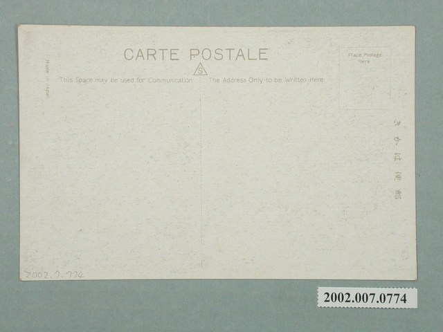 1.本物件以景色為主題,黑白樣式。正面為角板山之景象,山下有零散的民宅與樹木。左下角以英文字母書寫「VIEW OF THE FAMOUS PLACE SHINCHIKU」,以漢字書寫「(新竹名勝)角板山全景」、「新竹犬塜商店發行」。背面右上角為郵票黏貼處,右側有以漢字、平假名書寫之「郵便はがき」,上方以英文字母書寫「CARTE POSTALE」、「This Space may be used for Communication」、「The Address Only to be wtitten Here」、「Made In Japan」。2.日治時期此處曾設有角板山交易所,交易所為日人控制原住民經濟生活動重要單位。