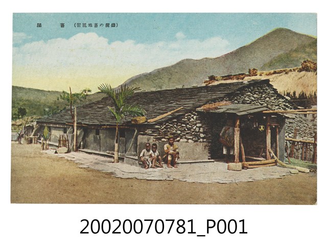 本物件為以原住民部落風俗為主題之明信片,其正面為原住民住屋彩色繪圖,影像中為一座原住民石板屋,右方的屋簷下有一人站立,石板屋的左邊有兩名原住民孩童及一名成人坐在屋子邊緣,影像左上方標註:「(臺灣の蕃地風習)蕃屋」。背面為空白明信片橫式書寫面,以灰色單色印刷,右上角有一方框為郵票黏貼處,右側標有「郵便はがき」,上方以英文標註「POST CARD」,中間有一飛馬圖樣,兩側分別寫有左「Correspondence」、右「Address」,中間位置有一道分隔線。