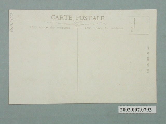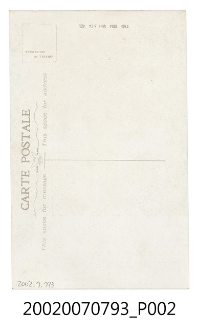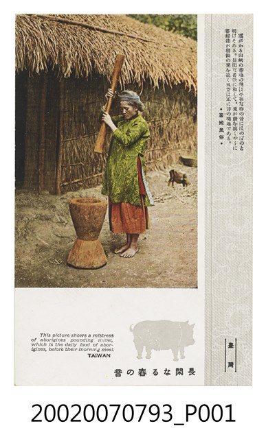 本物件為以悠然的搗樁聲為主題之明信片,其正面為原住民婦人搗樁彩色照片,影像中有一名頭戴灰色布帽,上身為綠色,下半身穿著紅色布裙的婦人,站在茅草屋旁邊,拿著杵進行搗粟,右方標註:「靄がかる山峽の蕃地の朝は平和な杵の音にほのぼのと明けそめる。長閑な蕃歌に和して、兔が餅を搗くやうに蕃婦達か朝餉の粟を搗く風景は正に詩の境地である。」(大意為:在霧靄瀰漫的早晨山谷中,平和的杵音迴盪,使周圍突然明亮了起來。配合著閑適的原住民歌曲,清晨搗餅做早餐的原住民婦人,其風景就像詩一樣)、「˙蕃地風俗˙」、「臺灣」,左下方標註「This picture shows a mistress of aborigines pounding millet,which is the daily food of aborigines,before their morning meal.」、「TAIWAN」、「長閑なる舂の音」,文字右邊印有動物豬的灰色浮水印。背面為空白明信片直立式書寫面,以黃褐色單色印刷,左上角一方框,內寫有「MANUFACTURE BY TAISHO」,方框右側有「郵便はがき」,明信片左方位置標有「CARTE POSTALE」,以及一隻張開雙翼,腳抓持「TAISHO」的鳥,並標有「TRADE MARK」,分隔線上下兩旁英文字,上為「this space for address」、下為「this space for message」。