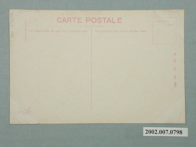 本物件為以手持杵的原住民婦人為主題之明信片,其正面為拿著杵的原住民婦人黑白照片,影像中有一名原住民婦人站在茅草建成的房屋旁邊,其前方擺有一個臼,手上拿著杵正在進行搗樁,影像左側有標註「杵を持つ蕃婦」、「臺灣の旅行者にとつて蕃人の生活は確に興味の一焦点である。月世界の兔にでも借りて來た樣た杵と臼を、萱葺の蕃屋の軒先に持出して働いてゐる處何となく神代の繪卷にえもありさうな光景である。」(大意為:對來臺灣的旅行者而言,原住民的生活確實是讓人感興趣的焦點之一。使用傳說中跟居住在月亮上的兔子借來的杵跟臼,在以茅草建築的屋舍前工作的原住民,其景象就像神話時代繪卷上的景象。)右下角白色方框中標註:「臺灣所見」。背面為空白明信片橫式書寫面,以粉紅色單色印刷,右上角有一方框,內標註「Taisho Hato Brand」,右側標註「郵便はがき」,左下角位置有一隻張開雙翼,爪持「TAISHO」的鳥,並於兩旁分別寫有「TRADE」、「MARK」,明信片左上角位置以小字標示「Made in Wakayama」,上方印有「CARTE POSTALE」,其下方右側「The Address Only to be Written Here」,左側「This Space may be used for Communication」,中間有一條分隔線。