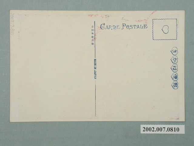 1本物件為以山地住民泰雅族織布為主題之明信片,其正面為正在進行織布的原住民婦人,影像正前方有1名頭戴綠色布帽,身著灰色布衣的婦人正在操作織布機進行織布,使用的是水平背帶織布機,上有一塊白色的布匹;影像下方標註:「臺灣タイヤル族生蕃人の機織」、「Weaving by Trnyal trive Formosa.」。背面為空白明信片直式書寫面,以藍色單色印刷,左上方框中有一心型圖樣,上方有5個心型中分別寫有「郵便はがき」,左方標有「CARTE POSTALE」,中間標有「MADE IN JAPAN」,分隔線左下位置寫有「臺北藤倉發行」。2. 本明信片的標題為泰雅族人的織布情形,但在衣著及使用的織布機方面特徵皆非泰雅族人,實際上的拍攝對象可能是南部族群原住民。