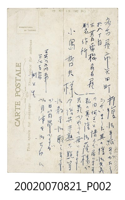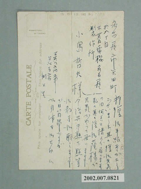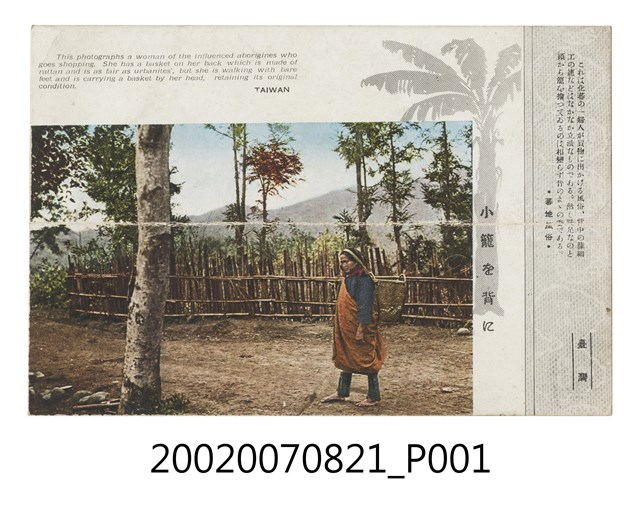 1. 本物件為以原住民聚落風俗為主題之明信片,其正面為一名泰雅族婦女彩色照片,影像中有一名披著橘色布,以額頭背負背籃的婦女,其後方為竹製的圍籬,影像左上方標註:「This photographs a woman of the influenced aborigines who goes shopping. She has a basket on her back which is made of rattan and is as fair as urbanites, but she is walking with bare feet and is carrying a basket by her head, retaining its original condition.」、「TAIWAN」,影像右側標註「小籠を背に」、明信片右側標註「これは化蕃の一婦人が買物に出かける風俗、背中の藤細工の籠などはなかなか立派なものである。然し跌足なのと頭から籠を擔つてゐるのは相變らず昔のま、の姿である。」(大意為:原住民婦人購物情形,她背上的籃子是用藤編製而成,並赤腳走路,以額頭支撐著籃子的重量)、「˙蕃地風俗˙」、「臺灣」。背面為明信片直式書寫面,以黃褐色單色印刷,左上角一方框,內寫有「MANUFACTURE BY TAISHO」,方框右側有「郵便はがき」,明信片左方位置標有「CARTE POSTALE」,以及一隻張開雙翼,腳抓持「TAISHO」的鳥,並標有「TRADE MARK」,分隔線上下兩旁英文字,上為「this space for address」、下為「this space for message」。2. 背籃為泰雅族常用的搬運工具之一,男性與女性的背籃因分工方式而不同,男性的背籃有兩條背帶,女性的只有一條,背負方式為將背帶置於額頭。