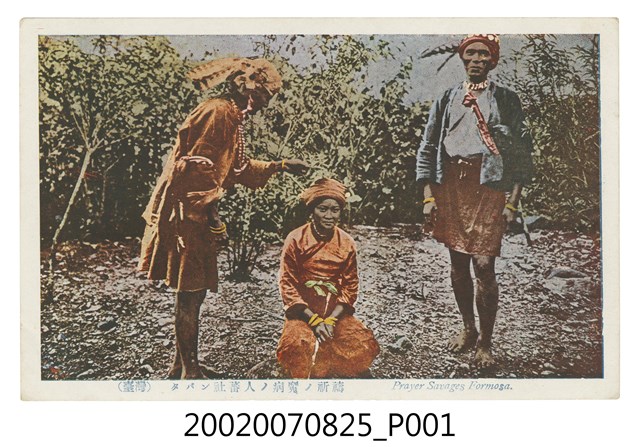 1. 本物件為以達邦社原住民治病祈禱情形為主題之明信片,其正面為巫師治病情形彩色照片,影像中有3名達邦社原住民,最右邊為1名頭戴紅色布帽,插有兩隻羽毛,並身穿藍色上衣的男性,中間有1名全身穿著橘紅色,並頭戴橘紅色布帽的女性坐在地板上,最左側為一名頭戴土色帽子,抽有兩根羽毛,頸部掛有珠鍊,全身穿著皆為橘色的男性,將其手指置於中間女性頭頂上方進行祈禱的巫師,影像下方標註由左至右:「(臺灣)タバン社蕃人ノ病魔ノ祈禱」、「Prayer Savages Formosa.」。背面為空白明信片橫式書寫面,以藍色單色印刷,右上角有一方框為郵票黏貼處,右側部分寫有「郵便ハガキ」,左側標有「生蕃屋發行」,正中央上方寫有三段文字,由上至下為「CARTE POSTALE POST CARD」、「POSTKARTE CARTOLINA POSTALE」、「ОТКРЬІТОЕ ІІИСЬМО」,中央有一道分隔線,並標有「MADE IN JAPAN」。2. 達邦社位置位於現在的嘉義縣阿里山鄉。