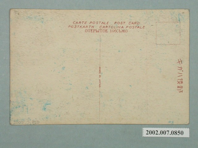 1.本物件為以臺灣原住民為主題之明信片,其正面為阿美族女子製做陶器黑白照片,畫面中可見前方有數個土製容器,阿美婦人正彎腰修整陶器的外型,畫面左側為房屋,屋頂亦為茅草鋪設,遠景則有木材、樹林,明信片正下方有「Eaxthern-wares are being made by Savage Woman」、「(台灣)アミ族婦女の土器製作」、「生蕃屋商店發行」其背面為空白明信片直式書寫面,以紅色單色印刷,左上有郵票黏貼處,上方有「郵便ハガキ」字樣,左側有「CARTE POSTALE POST CARD」及兩行字樣,由上至下為「POSTKARTE CARTOLINA POSTALE」、「OTKPbITOE IIИCbMO」,中央處有「MADE IN JAPAN」字樣。2.阿美族主要分布於花東縱谷平原、丘陵地區,為臺灣原住民族中人數最多的一支族群,而陶器製作為阿美族工藝特色之一,且多為婦女製作,其用途廣泛,用於打水、祭祀、炊具皆有。