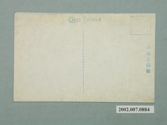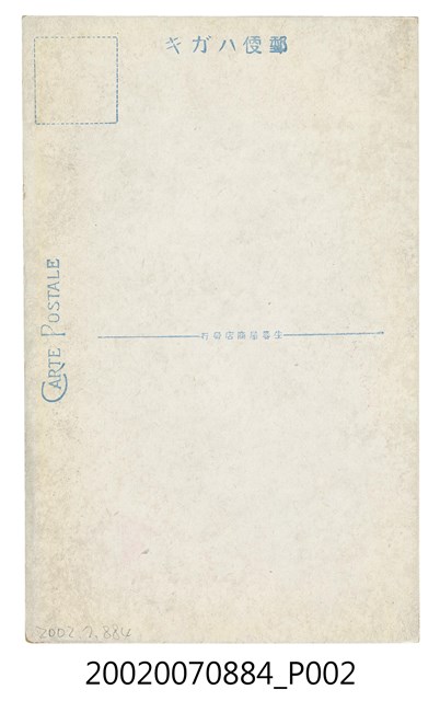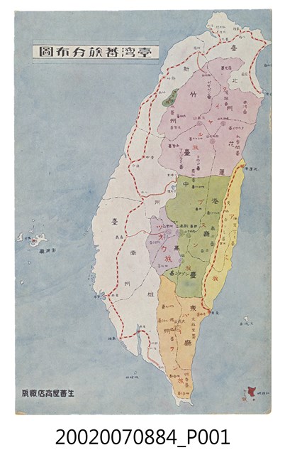 1.本物件為以臺灣原住民為主題之明信片,其正面為臺灣蕃族分布圖,畫面中可見1臺灣地圖標出行政區劃,並以紅白相間的樣式標出鐵路路線,再由不同顏色標出原住民族群分布位置,大致上位於東臺灣,明信片左上方有「臺灣蕃族分布圖」,左下方有「生蕃屋商店藏版」;背面為空白明信片直式書寫面,左上方為郵票黏貼處,正上方有「郵便ハガキ」,左側有「CARTE POSTALE」字樣,中間有「生蕃屋商店發行」。2.臺灣原住民屬南島語族,多分布於臺灣東部地區,在漢人開墾及日治時期的「理番政策」下,其生活空間不斷被壓縮,甚至是削弱文化特色,時至臺灣光復後原先以九族劃分,現今已增至十六族。
