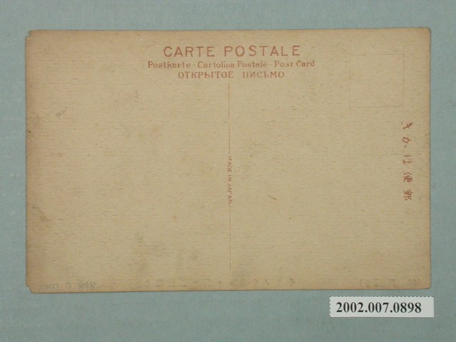 1.本物件為以水牛為主題之明信片,其正面為水中的水牛黑白照片,畫面中可見成群水牛於水池邊,眾多浸泡於水中,只剩角與鼻子在水面,後方為一片空曠,可見樹木與雜草,明信片下方有「台灣南部ニ於ケル水中ノ水牛」、「(不許復製)」;其背面為空白明信片橫式書寫面,以紅褐色單色印刷,右上方為郵票黏貼處,右側有「郵便はがき」字樣,正上方有「CARTE POSTALE」及兩行字樣,由上至下為「Postkarte-Cartolina Postale Post Card」、「OTKPbITOE IIИCbMO」,中央處有「MADE IN JAPAN」字樣。