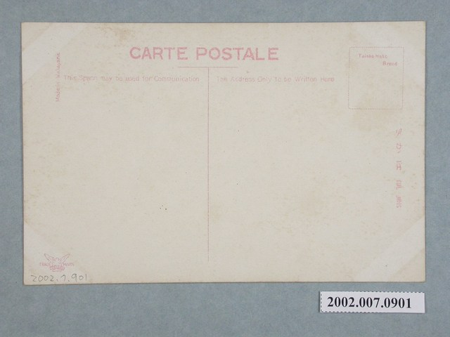 本物件為以婦人於路旁洗濯衣物為主題之明信片,其正面為婦人洗濯衣物之黑白照片,畫面中可見一婦女跪坐於水邊洗濯衣物,左側有字樣「路傍の洗濯 宜蘭の路傍スケツチで 、本島婦人の洗濯であろ。路傍の清流に盥を運ぴ、よく揉みよく濯ぐ、手にすろは最愛の良人の肌著か?それごもいごしい我が子のいたづらで污した上衣か?」大意為:臺灣婦女於路旁洗滌,將衣服運送到路邊的小溪並沖洗乾淨,手中的衣服是愛人的,或是孩子淘氣弄髒的衣服呢?右下角印有「臺灣所見」字樣。背面為空白明信片橫式書寫面,以紅褐色單色印刷,右上角有郵票黏貼處,內有「Taisho Hato Brand」字樣,右側為「郵便はがき」,左側有「Made in Wakayama」。正上方有「CARTE POSTALE」及兩行字樣,由左至右為「This Sapce may be used for Communication 」、「The Address Only to be Written Here 」。
