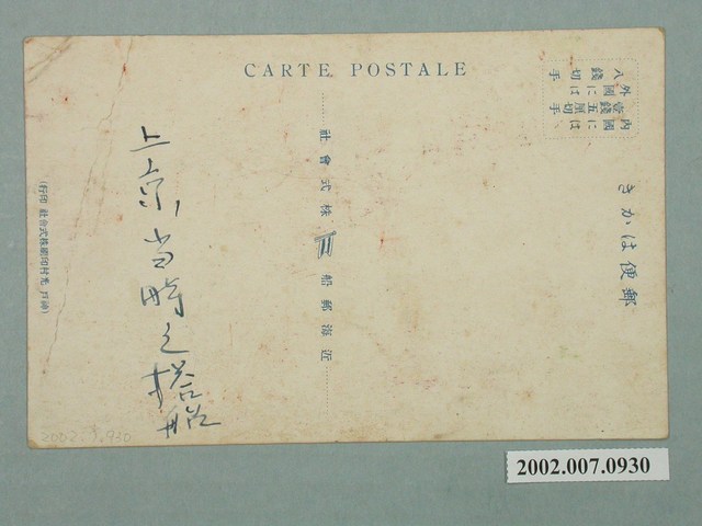 1.本物件為以汽船為主題之明信片,其正面為吉野丸彩色繪圖,畫面中可見吉野丸航於海上,船上有一煙囪冒黑煙,船身為藍黑色,接近底處為紅色,船側有「よしの丸」字樣,遠處有陸地,明信片左上方有「近海郵船株式會社」、「神戶基隆航線吉野丸」;背面為明信片直式書寫面,以藍色單色印刷,左上方有郵票黏貼處,內有「國內には壹錢五厘切手/外國には八錢切手」,正上方為「郵便はがき」,正下方為「(神戶光村印刷株式會社印行)」,左側有「CARTE POSTALE」字樣,正中間有「近海郵船株式會社」字樣,另有手寫「上京當時之搭船」字樣。