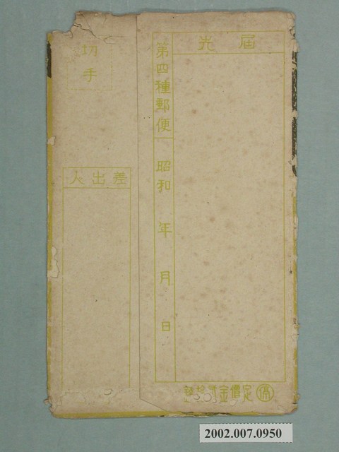 1.本物件為天然色臺灣風景繪葉書之封套,正面為黃色底色,下方繪有1竹筏,上站有2人,左上有1串香蕉,正面左上有1段文字「天然色臺灣の風物」;背面為為空白明信片直式書寫面,以黃綠色單色印刷,左上有郵票黏貼處,有「切手」字樣,右側為1表格,上方有「屆光」字樣,左下有「昭和年月日」字樣,左上有「第四種郵便」字樣,表格右下方有「定價金貳拾錢」,及以圓形圈住之「停」字樣,左下另有1表格,上方有「差出人」字樣。2.繪葉書,即為今日之明信片,為日治時期帶入之產物,首次發行於西元1905年,由臺灣總督府發行的始政十年紀念繪葉書,繪葉書上通常印有該地的特色物產或風景,常被作為觀光旅遊時的紀念品,除此之外,繪葉書上所印之圖像,亦是宣傳日本政府於臺灣殖民成果的一種方式,能讓未至帝國南疆的內地居民或是外國人,都能感受到其治理的榮景,並對臺灣加以認識。