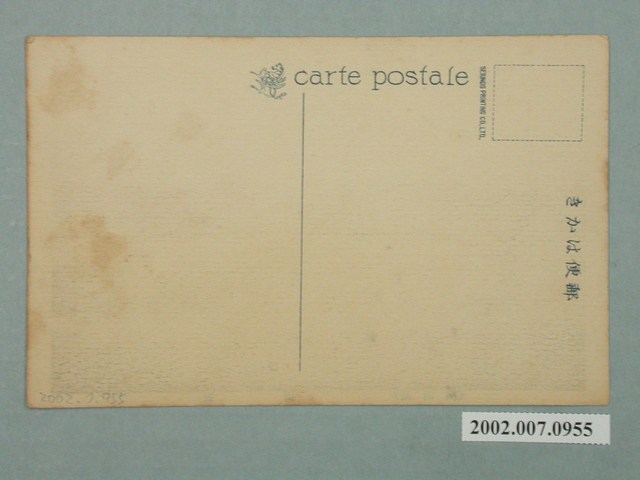 1.本物件為以鹽田為主題之明信片,其正面為鹽田黑白照片,影像中為至遠方的鹽田,以方形阡陌相連,中央偏左位置處有兩人站立在鹽田中,影像下方標註「鹽田」、「(臺南州)」。背面為空白明信片橫式書寫面,以藍黑色單色印刷,右上方框為郵票黏貼處,其左側有「SEIUNDO PRONTING CO., LTO.0」,明信片右側有「郵便はがき」,上方有一飛馬圖樣,其右側寫有「carte postale」,中央有1分隔線。