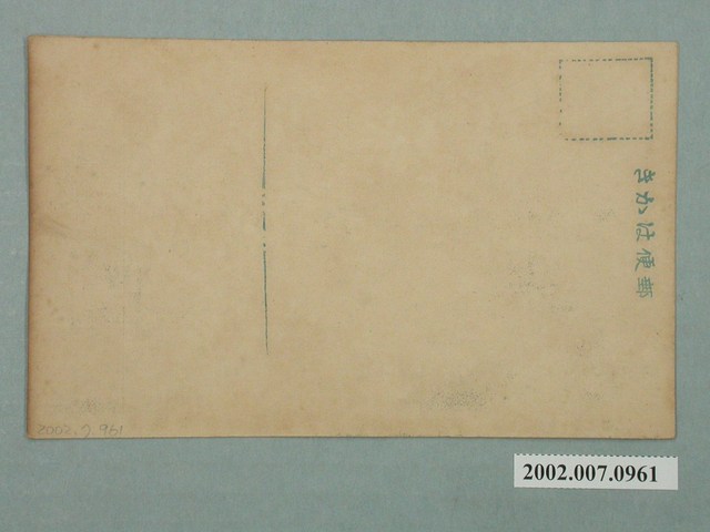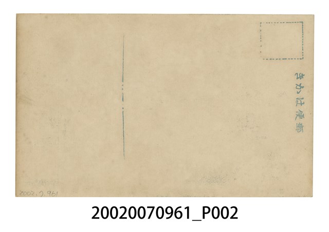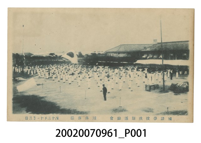 1.本物件為以國語學校秋期運動會團體體操為主題之明信片,其正面為團體體操黑白照片,影像右側有一支旗桿,其前方有疑似講臺的方形立檯,中間偏下位置有一身穿黑色衣服的人,影像中央為排列整齊,上下衣服皆為淺色的學生隊伍,雙手向上張開進行團體體操,左方偏中位置有一日本國旗,影像下方標有「國語學校秋期運動會」、「團体体操」、「四十三年十一月三日」(意指明治43年(西元1910年)11月3日)。背面為空白明信片橫式書寫面,以藍色單色印刷,右上方框為郵票黏貼處,右側有「郵便はがき」,中間偏左位置有一分隔線。