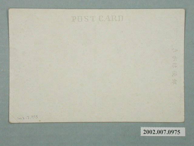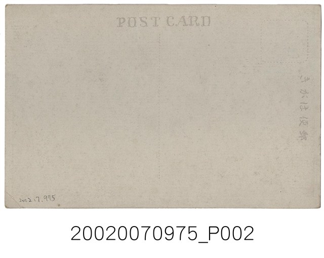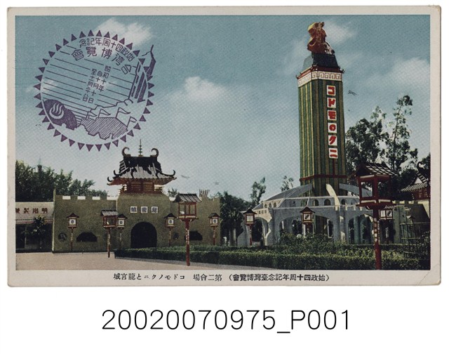 1.本物件為以始政四十周年紀念臺灣博覽會龍宮城為主題之明信片,其正面為第二會場兒童之國龍宮城彩色繪圖,畫面中可見有一高起的綠色建築上有「コドモノクニ」字樣,左側則為一宮殿屋頂造型建築,整體為綠色樣式,上有「龍宮城」字樣,前方則有修剪過的綠色庭院植栽,明信片下方有「(始政四十周年記念臺灣博覽會)第二會場コドモノクニと 龍宮城」,左上方則有一藍色圓形紀念戳章,內有博覽會全名以及「昭和十年自十月十日至十一月二十八日」,並有一溫泉標示圖樣;背面為空白明信片橫式書寫面,以灰色單色印刷,右上方為郵票黏貼處,右側有「郵便はがき」,正上方有「POST CARD」字樣。2.始政四十年紀念臺灣博覽會為西元1935年10月至11月以臺北為主舉辦的博覽會,目的為宣傳其統治的政績,及臺灣各項政策的成果,主要分為四個會場,第一會場位於臺北公會堂附近,第二會場於今二二八公園,第三會場於迪化街附近,第四會場於陽明山;此一期間各地政府亦有各自舉辦小規模展覽和活動。兒童之國位於第二會場南邊,其設計者為日本兒童遊樂場創始者長谷公司,內有兒童文化館、鞦韆、木馬等各項設施,龍宮城亦為其中之一。