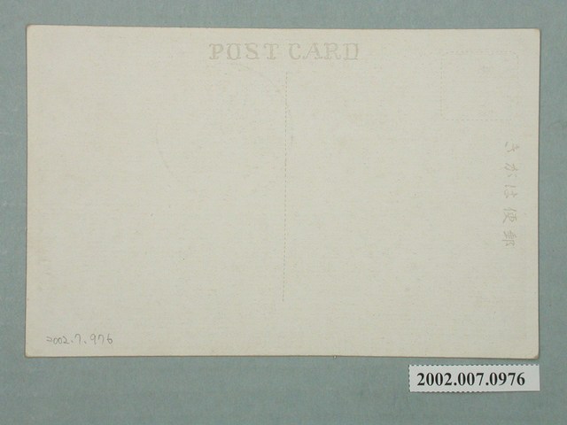 1.本物件為以始政四十周年紀念臺灣博覽會,第二會場國防館及第二文化施設館為主題之明信片,其正面為國防館及第二文化設施館黑白照片,畫面中可見第二文化施設館為淺色建築,入口處旁有「第二文化施設館」字樣,館的正上方插有日本國旗,畫面中右側則為國防館,可見其建築外觀呈現橫條紋樣式,入口上方有「國防館」字樣,明信片下方有「(始政四十周年記念臺灣博覽會)第二會場國防館及第二文化施設館」,正上方則有一藍色圓形紀念戳章,內有博覽會全名以及「昭和十年自十月十日至十一月二十八日」,並有椰子樹圖樣;背面為空白明信片橫式書寫面,以灰色單色印刷,右上方為郵票黏貼處,右側有「郵便はがき」,正上方有「POST CARD」字樣。2.始政四十年紀念臺灣博覽會為西元1935年10月至11月共50日的博覽會,舉辦地點以臺北為主,為宣傳其統治的政績,及臺灣各項政策的成果,主要分為四個會場,第一會場於臺北公會堂附近,第二會場於今二二八公園,第三會場於迪化街附近,第四會場於陽明山,而各地政府也各自舉辦小規模的展覽和活動。第二會場主要分為兩部分,北邊為展覽館,南邊為娛樂休憩場域。國防館展示主題為日本國內海陸空三軍的軍事設備,並宣傳現代化的軍事國防思想;第二文化設施館位於第二會場東北角,以官廳的展覽品為主,以理番、衛生、警務、司法為主要展示內容,強調日本治理臺灣的文化發展面貌。