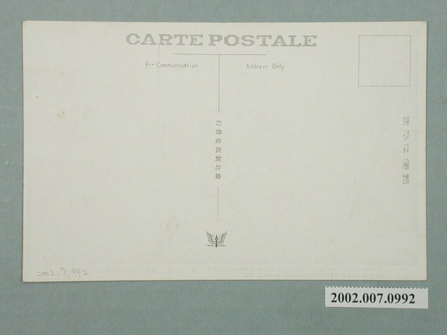 1.本物件為以始政四十周年紀念臺灣博覽會第二會場大阪館為主題之明信片,其正面為大阪館黑白照片,畫面可見一建築,上方有「SOUVENIR OF OSAKA」、「大阪舘」字樣,入口門上方亦有「大阪舘」字樣,畫面右側高起的建築上方有插旗,明信片下方有「(始政四十周年記念臺灣博覽會)第二會場大阪館」、「THE GRAND SIGHT OF FORMOSA EXHIBITION FOR THE COMMEMORATION OF THE 40TH YEAR OF ITS FOUNDATION UNDER JAPANESE RULE」;背面為空白明信片橫式書寫面,以灰色單色印刷,右上方為郵票黏貼處,右側有「郵便はがき」,正上方則有「CARTE POSTALE」以及「For Communication」、「Address Only」,正中間則有「臺北新高堂發行」字樣。2.始政四十年紀念臺灣博覽會為西元1935年10月至11月共50日的博覽會,舉辦地點以臺北為主,為宣傳其統治的政績,及臺灣各項政策的成果,主要分為四個會場,第一會場於臺北公會堂附近,第二會場於今二二八公園,第三會場於迪化街附近,第四會場於陽明山,而各地政府也各自舉辦小規模的展覽和活動。大阪館為第二會場特設館之一,本館由大阪出品聯合會經營,旨在宣傳大阪物產,於博覽會期間除了賣店生意佳,尚促成多筆交易契約。