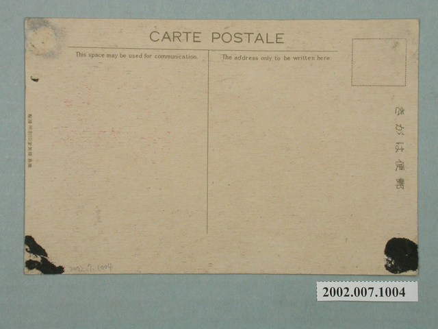1.本物件為以始政四十周年記念臺灣博覽會,第一會場入口為主題之明信片,正面為第一會場入口黑白照片,畫面中可見其建物正面樣貌,建物上有「第一會場」、「臺灣博覽會」、「始政四十周年紀念」字樣,並有些許民眾,右下有1段文字「始政四十周年紀念臺灣博覽會」,左上有1段文字「第一會場入口」,右上有1紅色圓形戳印,印有建物與山的圖案,由上至下有「始政四十周年記念臺灣博覽會」、「昭和十年十月十日至十一月二十八日」2段字樣;背面為空白明信片橫式書寫面,以黑色單色印刷,右上處為郵票黏貼處,右側有「郵便はがき」字樣,左側有「廣島精美堂印刷所謹製」字樣上方有「CARTE POSTALE」及2行字樣,由左至右為「This space may be used for communication」、「The address only to be written here」。2.始政四十年紀念臺灣博覽會為西元1935年10月至11月以臺北為主舉辦的博覽會,分為4個會場,第一會場於臺北公會堂附近,第二會場於今二二八公園,第三會場於迪化街附近,第四會場於陽明山,而各地政府也各自舉辦小規模的展覽和活動。第一會場位於公會堂及南三線道路,設有產業館、林業館、糖業館、礦山館、交通土木館、興業館、第一府縣館、第二府縣館等14 館,為使民眾更方便參觀,搭有一座陸橋。